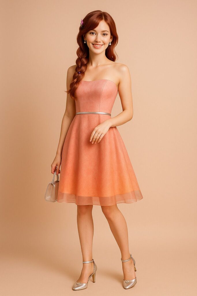 ファッション:ピンク〜オレンジのグラデーションドレス、ウエストに細いシルバーライン、裾は透け感あるオーガンジー