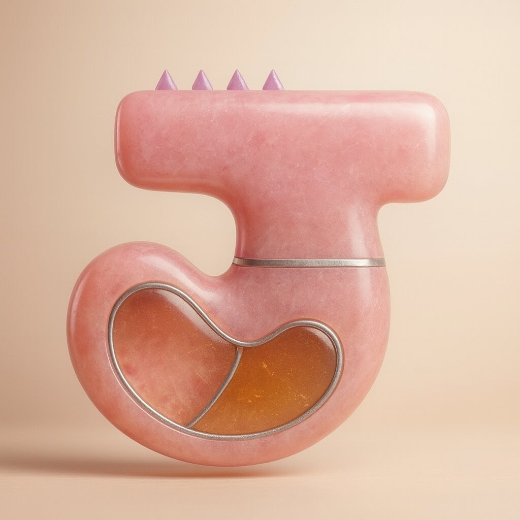 素材:桜色の鉱石のような質感、内側にはオレンジ色の液体層が漂う