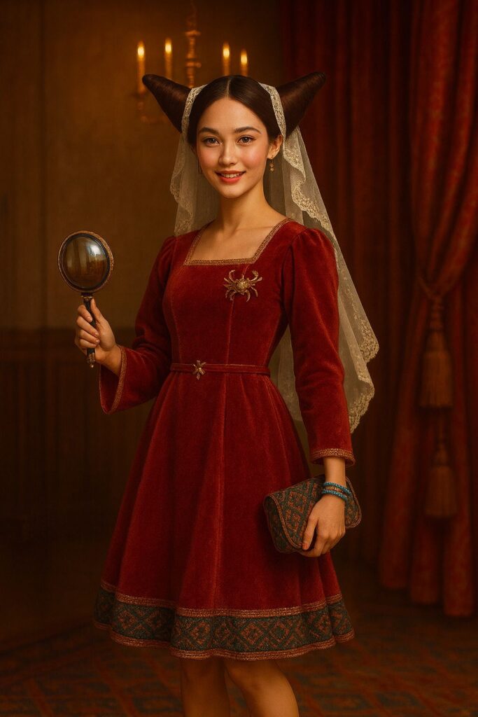 ドレス:赤ベルベットAライン。金糸パイピングで薄いJ字の縫取り。裾・袖口に青緑モザイク刺繍。細赤ベルト。