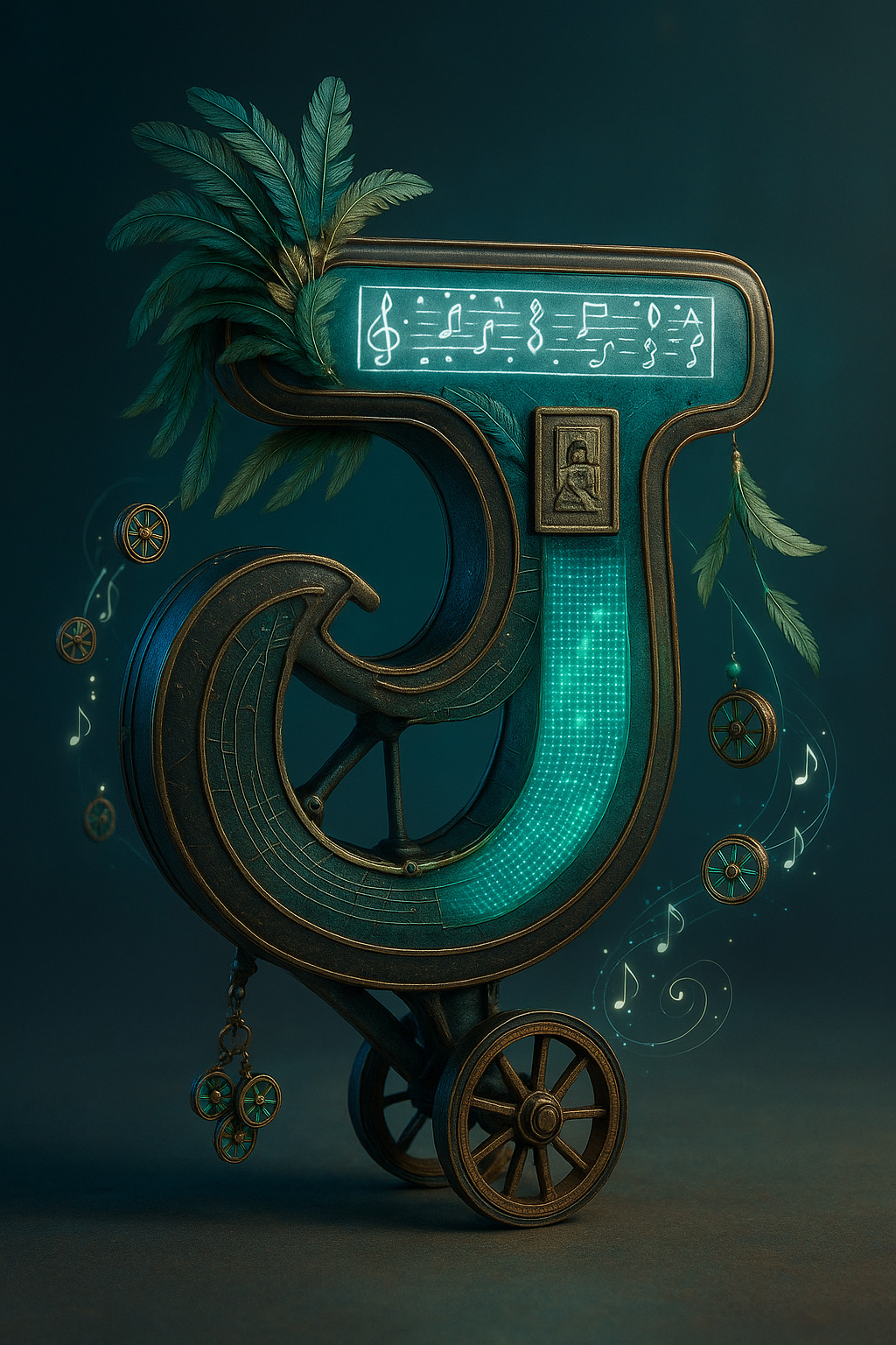 特徴:楽譜の線が光るスクリーンに走り、古代と未来をつなぐ学習装置のよう