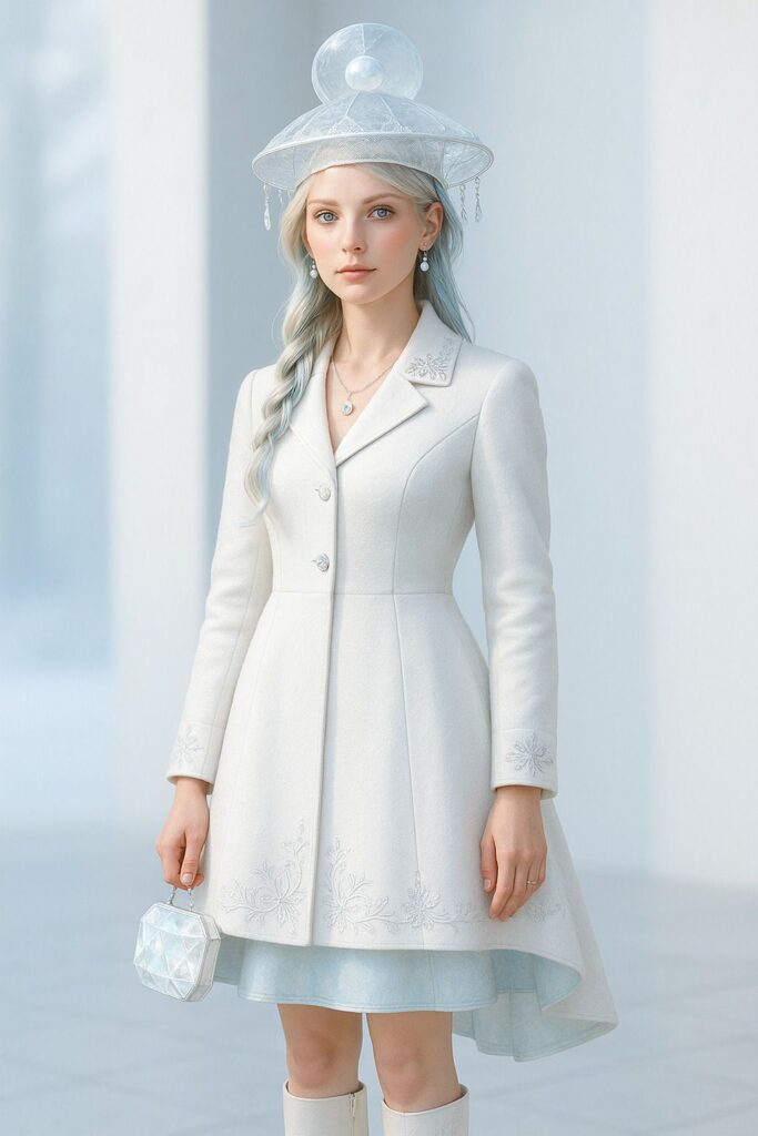服装:純白のコートドレス(膝丈)、襟と裾に氷晶刺繍、裏地は淡青グラデーション