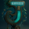 擬物化:J型フレームは風のリボンでできており、表面に古代ギリシャの松明模様とデジタル心拍ラインが交互に浮かぶ。